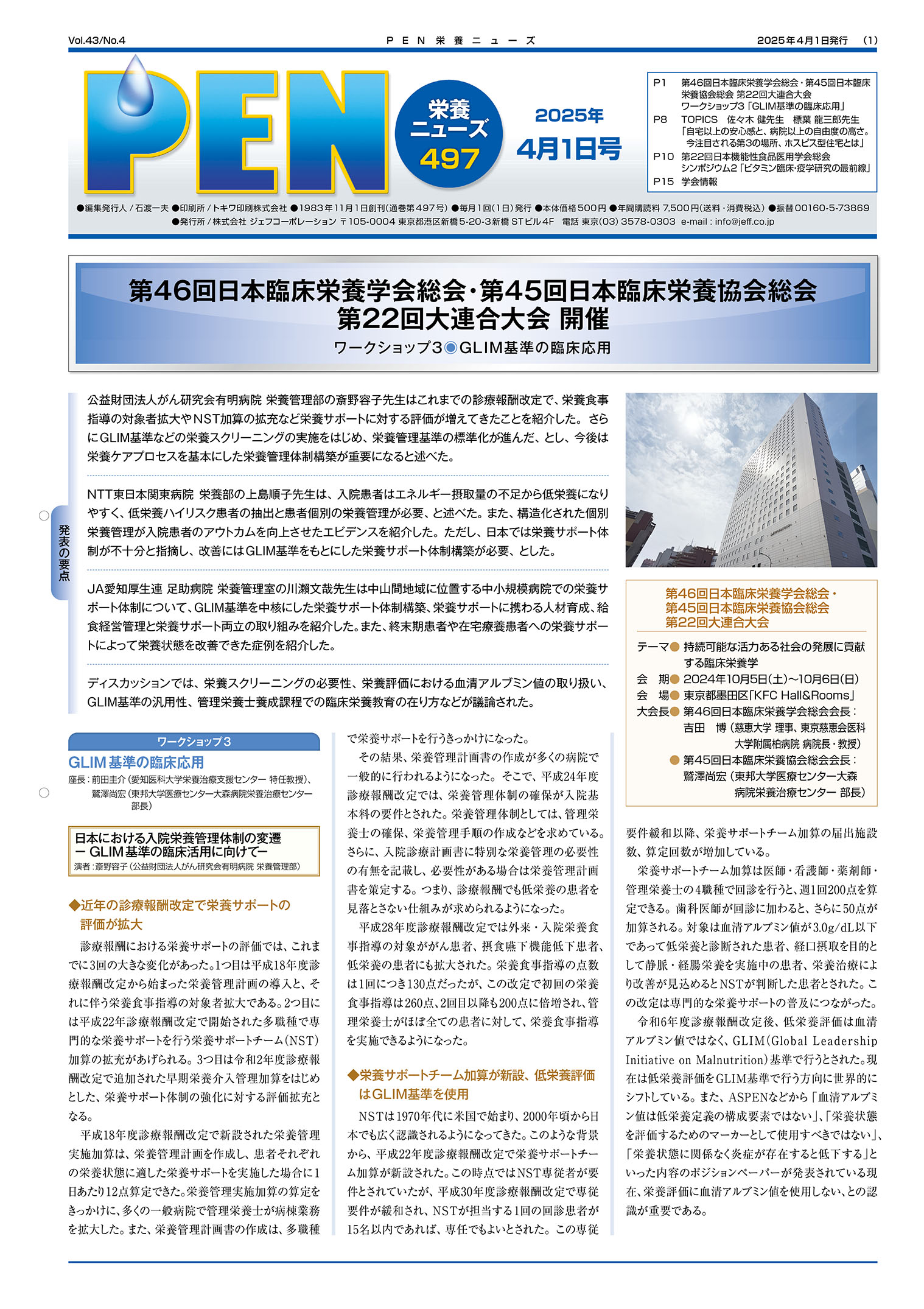 - NTT東日本関東病院 栄養部の上島順子先生は、入院患者はエネルギー摂取量の不足から低栄養になりやすく、低栄養ハイリスク患者の抽出と患者個別の栄養管理が必要、と述べた。また、構造化された個別栄養管理が入院患者のアウトカムを向上させたエビデンスを紹介した。ただし、日本では栄養サポート体制が不十分と指摘し、改善にはGLIM基準をもとにした栄養サポート体制構築が必要、とした。