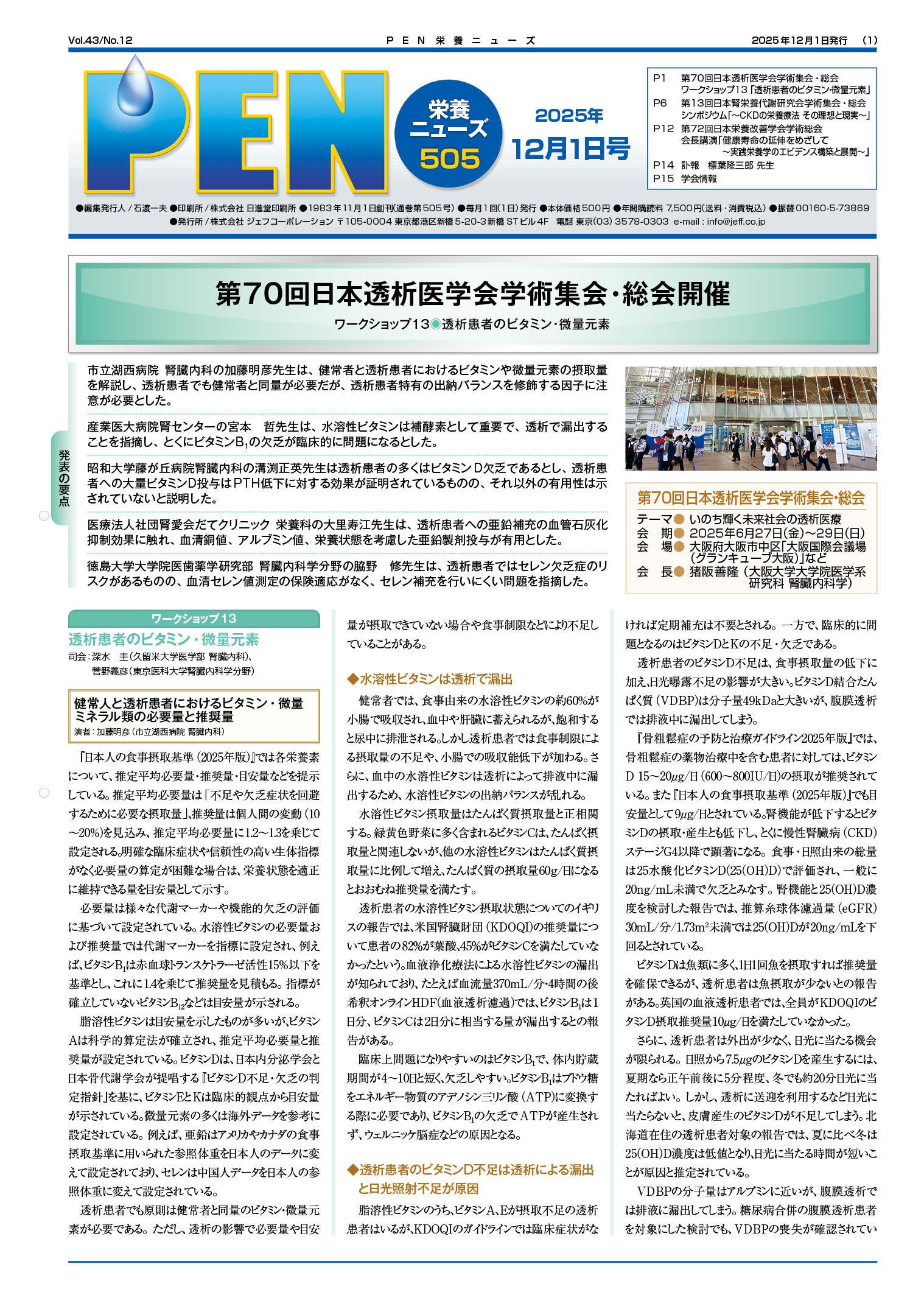 • 産業医大病院腎センターの宮本 哲先生は、水溶性ビタミンは補酵素として重要で、透析で漏出することを指摘し、とくにビタミンB1の欠乏が臨床的に問題になるとした。